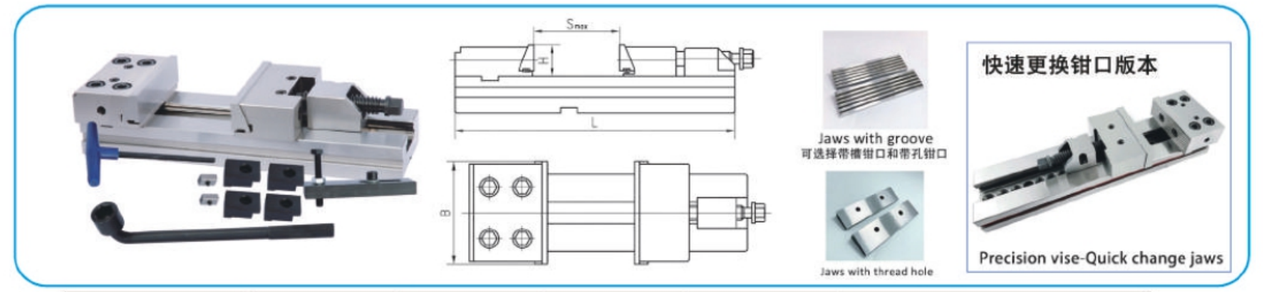Он имеет взаимозаменяемый базовый, фиксированная/подвижная челюсть быстро зажимается и легко работает